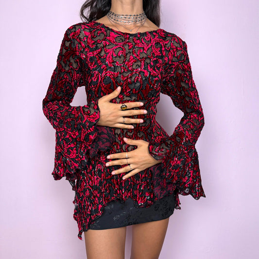 Vintage Y2K Red Black Devoré Burnout Velvet Sheer Bell Sleeve Top – Size M