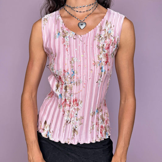 Vintage Y2K Pink Pleated Sleeveless Floral Sequin Top – Size M