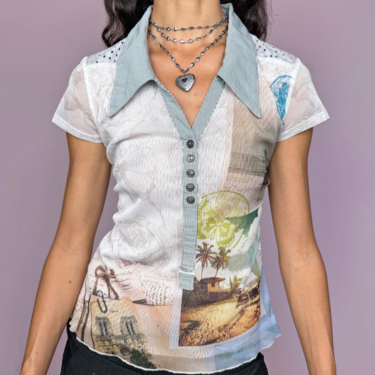 Vintage Y2K Graphic Landscape Collared Mesh Top – Size M