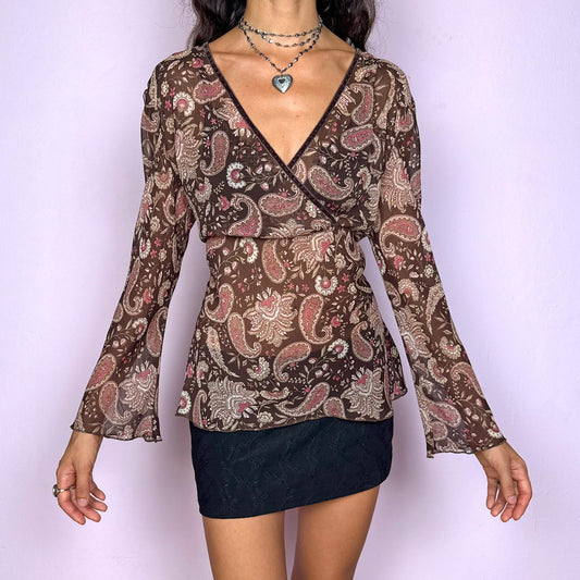 Vintage Y2K Paisley Brown Sheer Wrap Bell Sleeve Top – Size XL