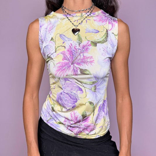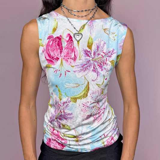 Vintage Y2K Floral Pastel Graphic Sleeveless Top – Size M