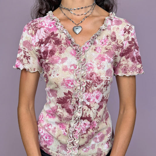 Vintage Y2K Ruffle Sheer Pastel Floral Mesh Top – Size M