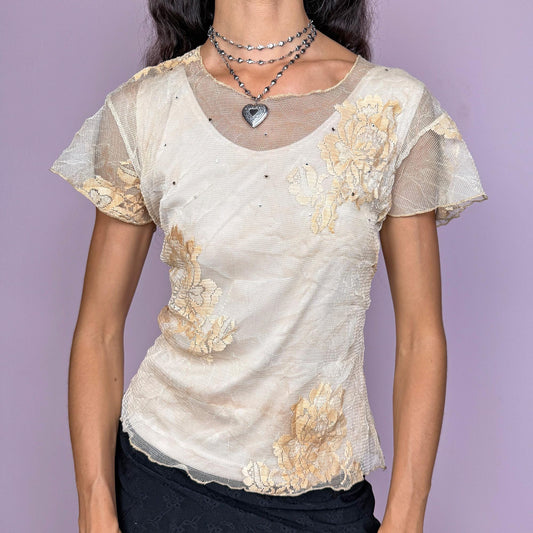 Vintage Y2K Beige Mesh Lace Top – Size L