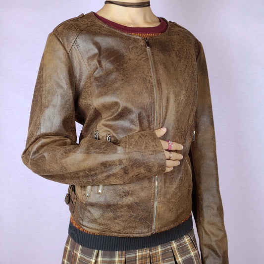 Vintage Y2K Brown Distressed Faux Leather Fitted Zip Moto Jacket – Size L