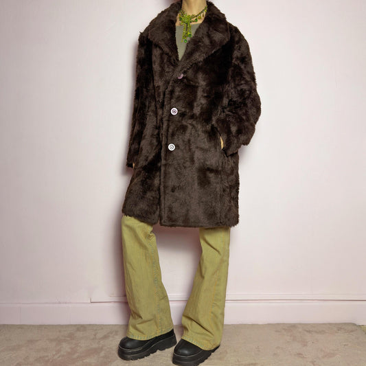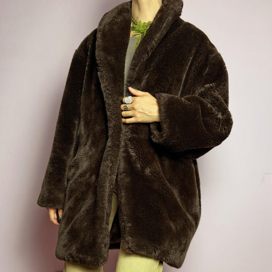 Vintage 90s Dark Brown Faux Fur Coat – Size XL