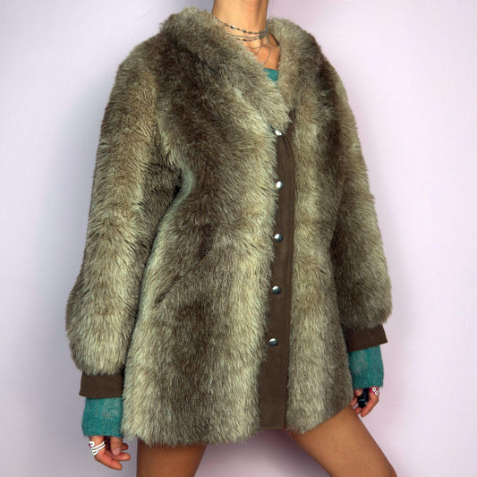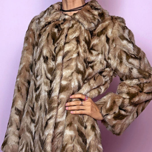 Vintage 90s Brown Beige Faux Fur Coat – Size M