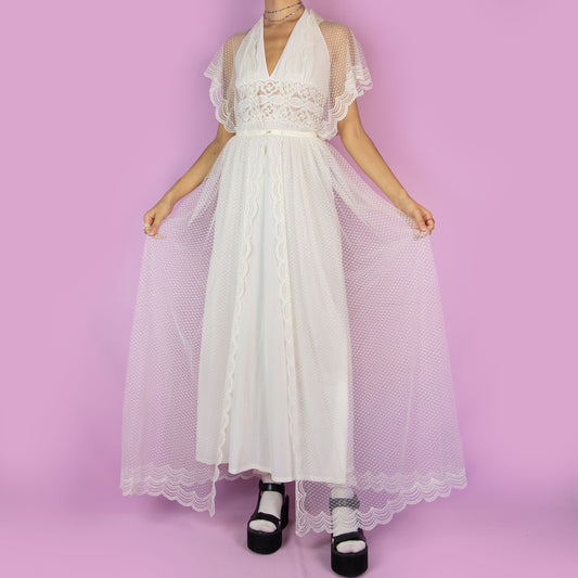 Vintage 90s White Sheer Lace Polka Dot Mesh Duster – Size S