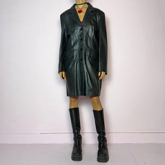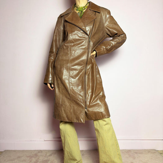 Vintage Y2K Brown Asymmetrical Zip Long Belted Leather Coat – Size L