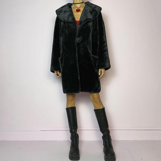 Vintage 90s Black Oversized Collar Faux Fur Coat – Size XL