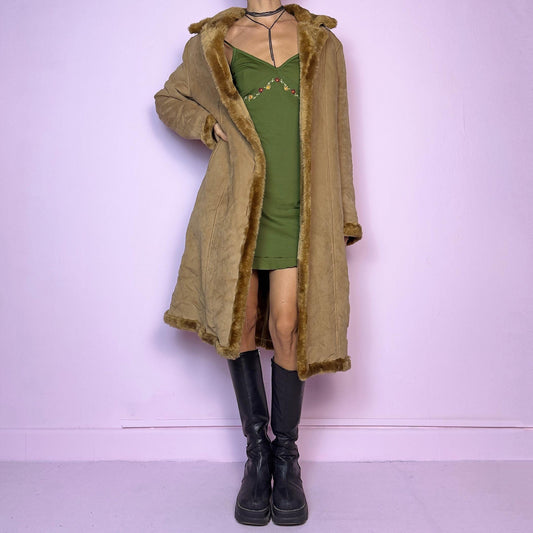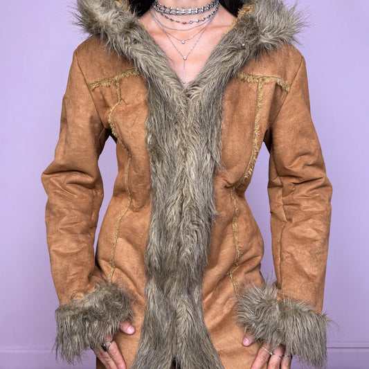 Vintage Y2K Camel Brown Faux Suede Fur Longline Coat – Size M