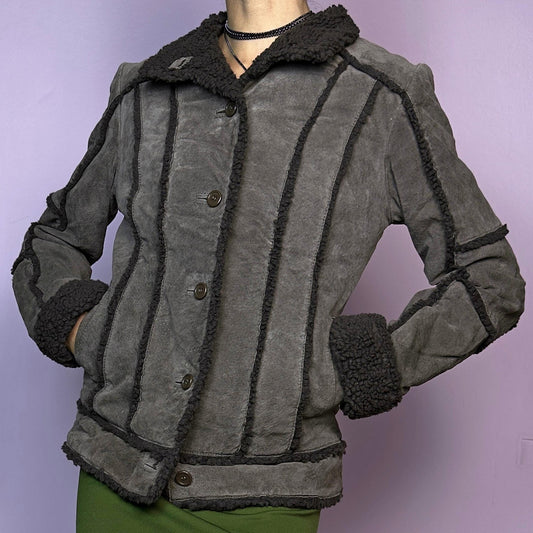 Vintage 90s Split Suede Leather Faux Shearling Brown Khaki Jacket – Size S