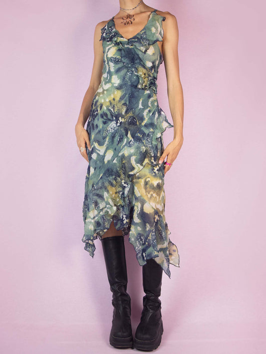 Vintage Y2K Asymmetric Floral Mesh Mini Dress – Size L