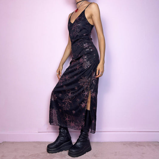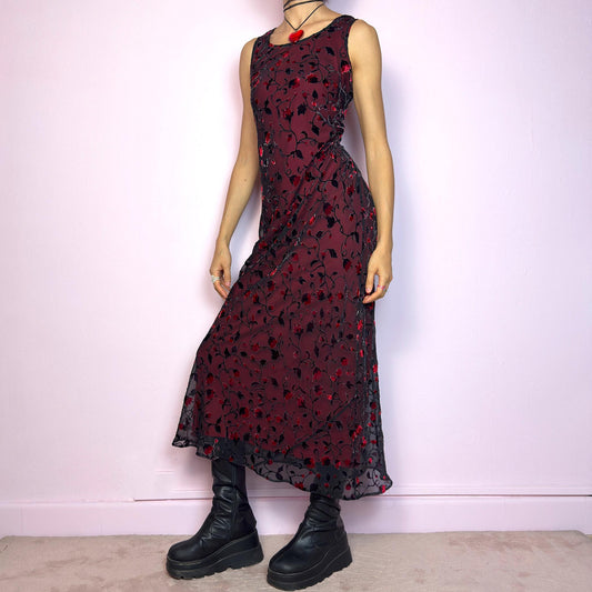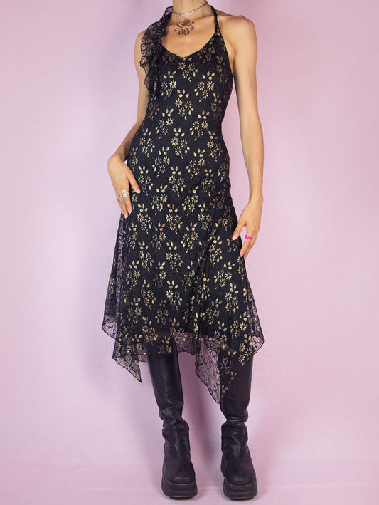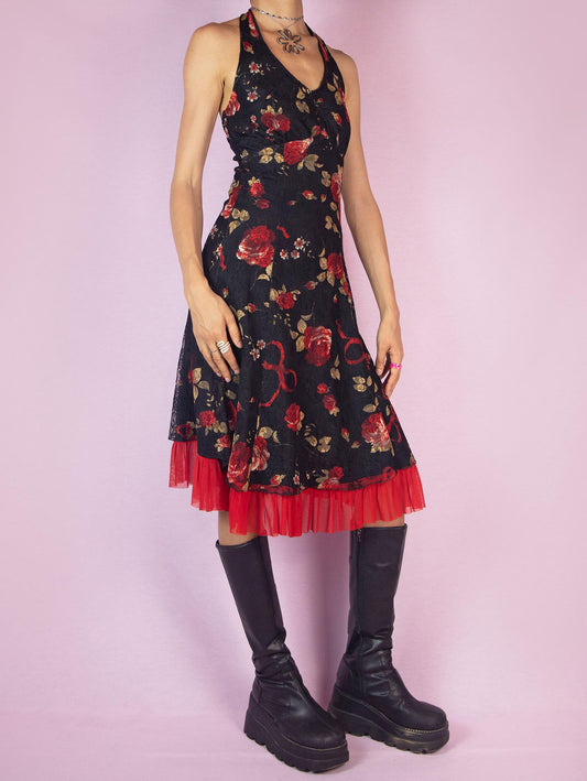 Vintage Y2K Black Halter Lace Rose Print Mesh Midi Dress – Size S