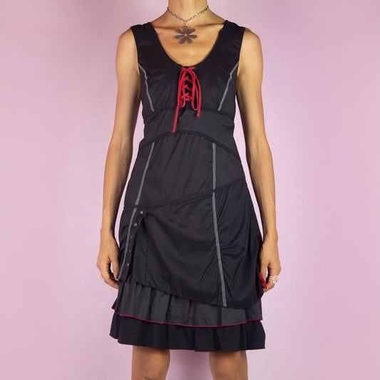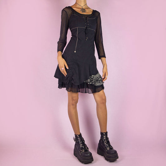 Vintage Y2K Black Lace Up Layered Mesh Mini Dress - Size L