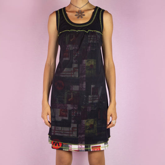 Vintage Y2K Black Sleeveless Mesh Layered Mini Dress – Size L