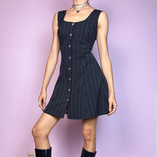 Vintage 90s Black Pinstripe Sleeveless Button Mini Dress – Size M
