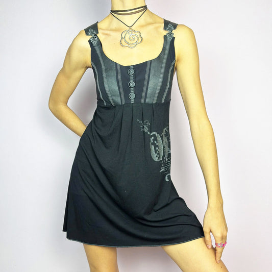 Vintage Y2K Black Cowl Tech Print Sleeveless Mini Dress – Size M