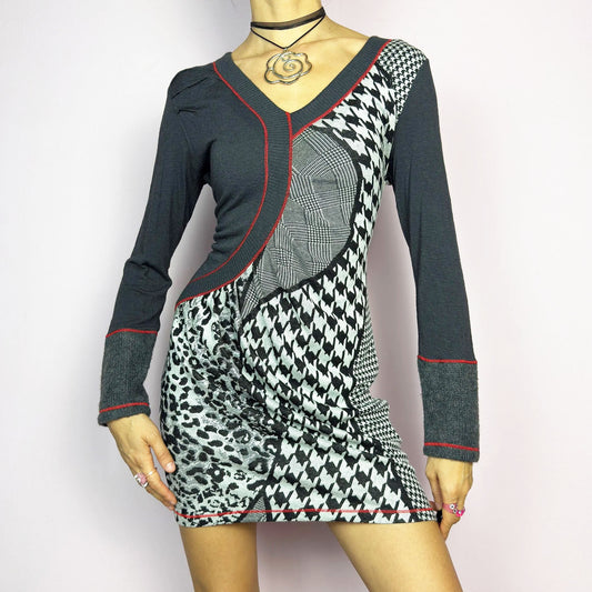 Vintage Y2K Gray Patchwork Houndstooth Leopard Mini Dress – Size M