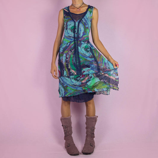 Vintage Y2K Mesh Art Print Layered Midi Dress – Size L