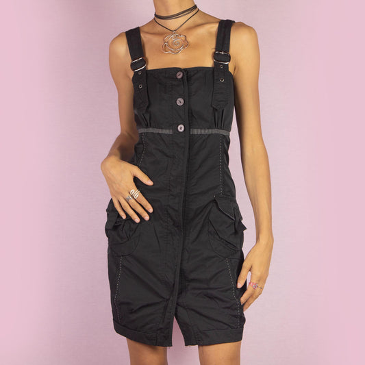 Vintage Y2K Black Buckle Strap Button Front Utility Mini Dress – Size M