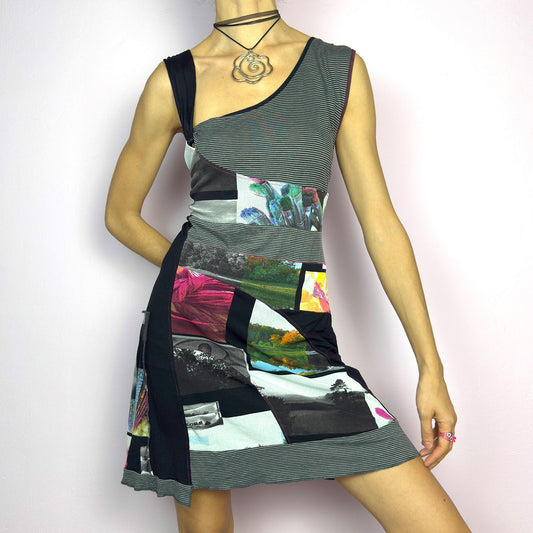 Vintage Y2K Patchwork Zip Front Sleeveless Mini Dress – Size L