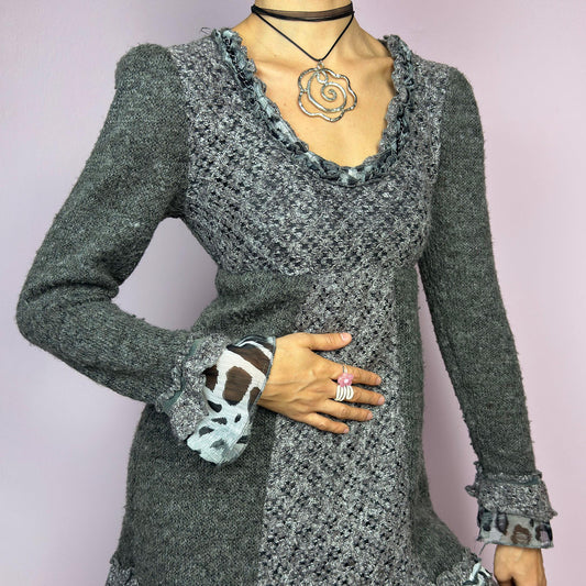 Vintage Y2K Gray Knit Ruffle Long Sleeve Mini Dress – Size S