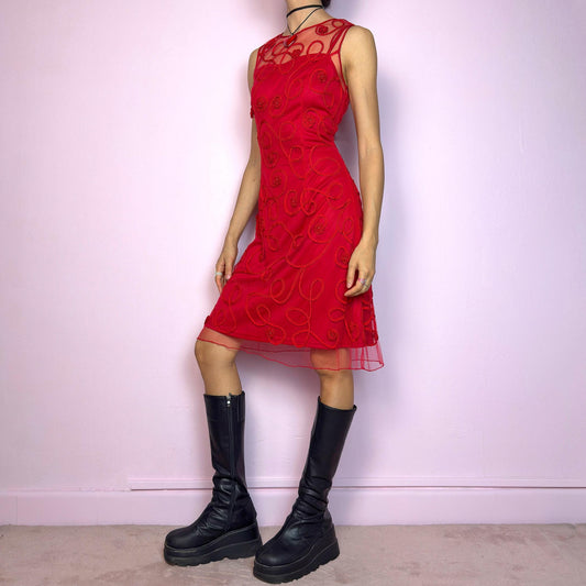 Vintage 90s Red Mesh Sheer Appliqué Cocktail Dress – Size S