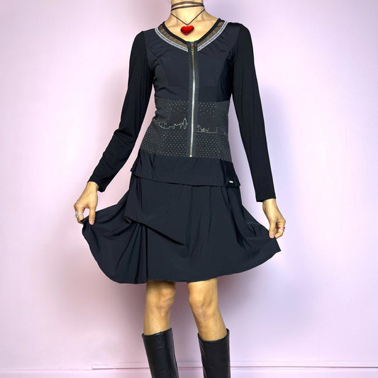 Vintage Y2K Black Long Sleeve Zip Front Mini Dress – Size S