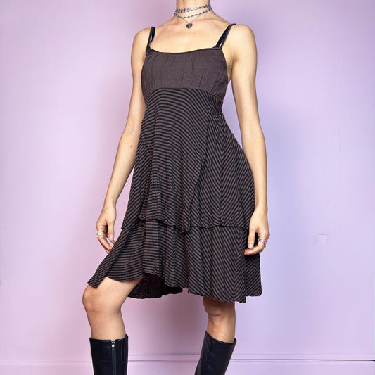 Vintage Y2K Brown Stripe Tiered Layered Midi Dress – Size L