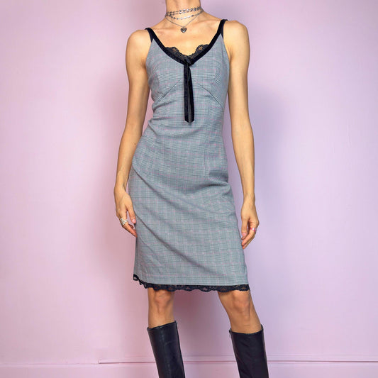 Vintage Y2K Gray Plaid Lace Trim Bow Midi Slip Dress – Size M