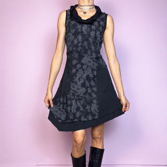 Vintage Y2K Black Paisley Asymmetric Cowl Sleeveless Mini Dress – Size M