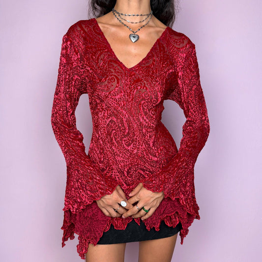 Vintage Y2K Red Black Devoré Burnout Velvet Sheer Bell Sleeve Top – Size M