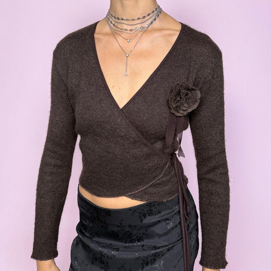 Vintage Y2K Brown Wrap Tie Rosette Mohair Cardigan – Size M