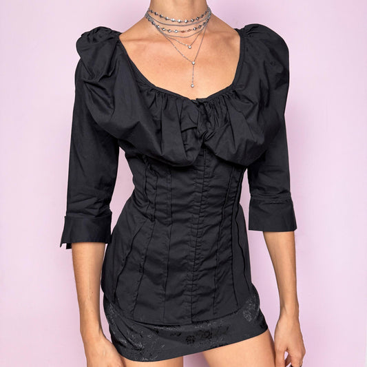 Vintage Y2K Black Ruffle Fitted Pleated Blouse – Size L