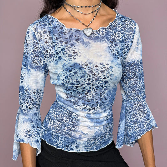 Vintage Y2K Blue Mesh Sheer Floral Abstract Bell Sleeve Top – Size S