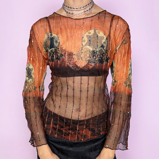 Vintage Y2K Mesh Orange Brown Graphic Sequin Sheer Top – Size L