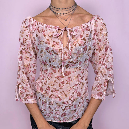 Vintage Y2K Pink Sheer Floral Tie Front Pastel Blouse – Size L