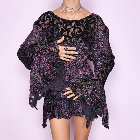 Vintage Y2K Purple Black Devoré Burnout Sheer Velvet Top – Size XL