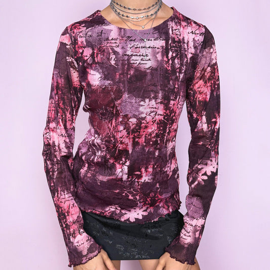 Vintage Y2K Purple Pink Mesh Sheer Abstract Graphic Top – Size M