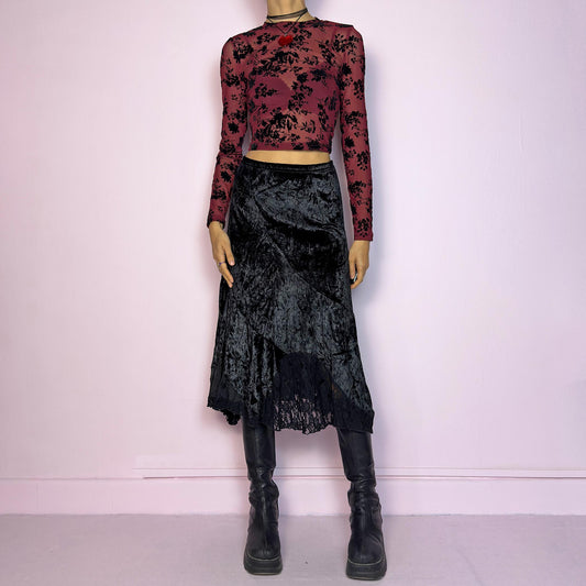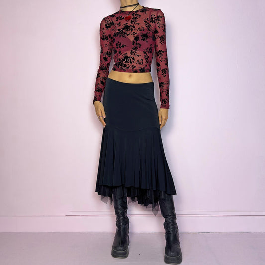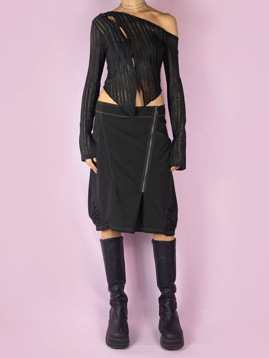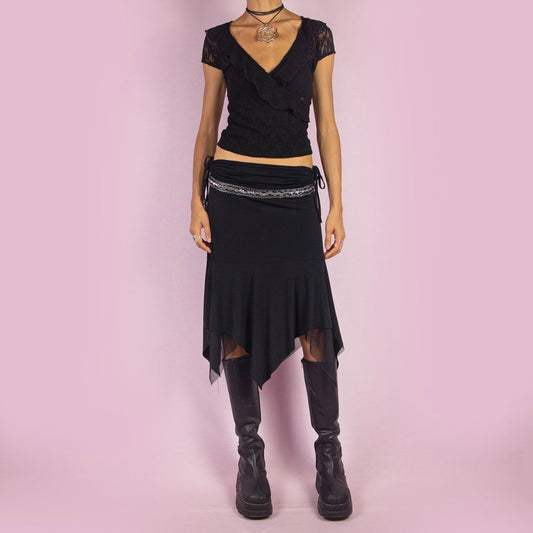 Vintage Y2K Black Layered Asymmetric Mesh Midi Skirt – Size S