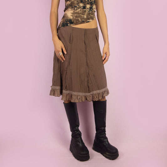 Vintage Y2K Brown Flared High Waist Crinkle Ruffle Midi Skirt – Size M