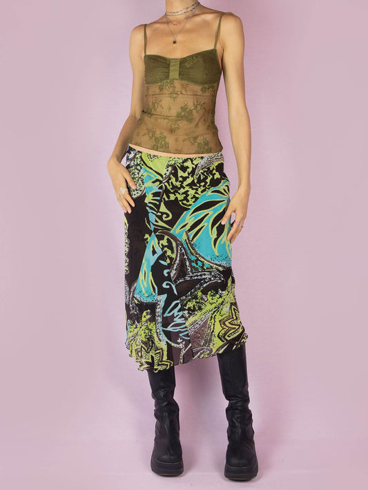 Vintage Y2K Mesh Midi Skirt, Asymmetric Tropical Sheer – Size L