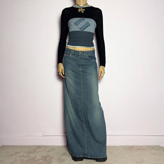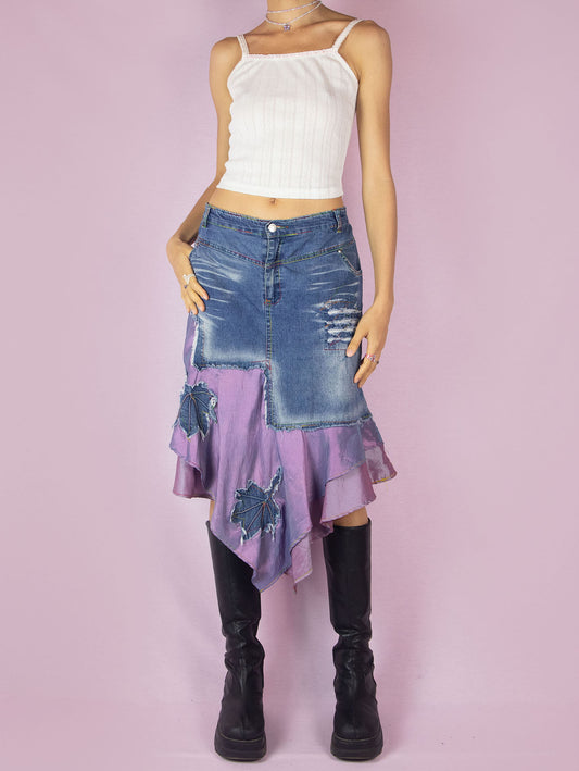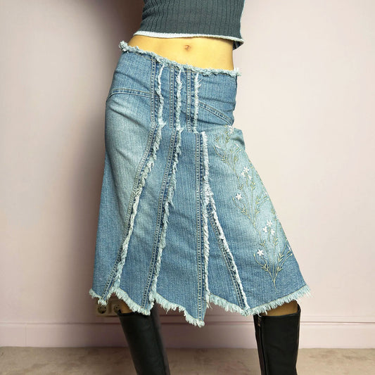 Vintage Y2K Denim Patchwork Flared Embroidered Midi Skirt – Size XS