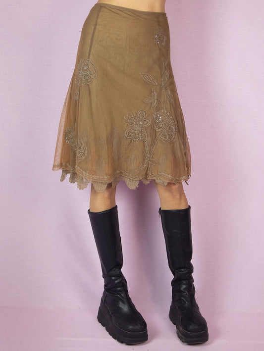 Vintage Y2K Brown Midi Skirt, Mesh Tulle Beaded Embroidered Godet – Size M