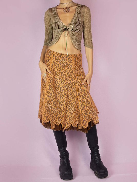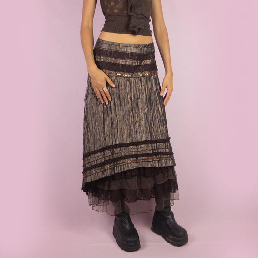 Vintage Y2K Brown Layered Crinkle Lace Mesh Midi Skirt – Size M