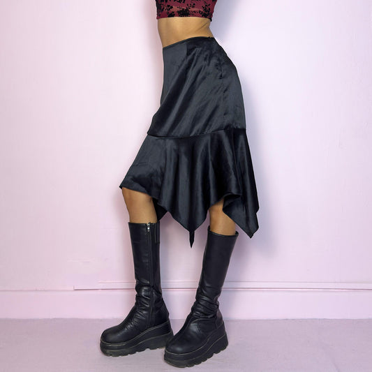 Vintage Y2K Black Satin Asymmetric Handkerchief Hem Midi Skirt – Size L