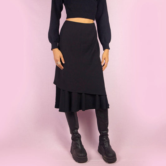Vintage 90s Black Layered Flared Underlayer Midi Skirt – Size L