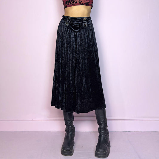 Vintage 90s Black Velvet Midi Elastic Waist Skirt – Size XS