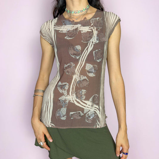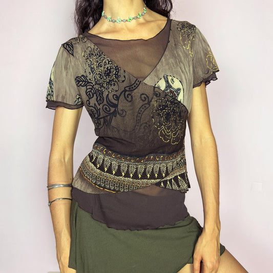 Vintage Y2K Brown Floral Wrap Asymmetric Sheer Mesh Top – Size L