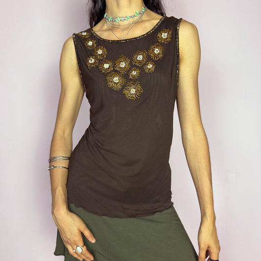 Vintage Y2K Brown Mesh Floral Crystal Beaded Top – Size XL